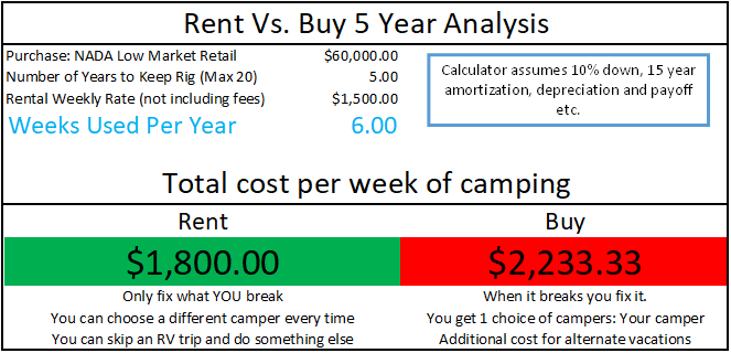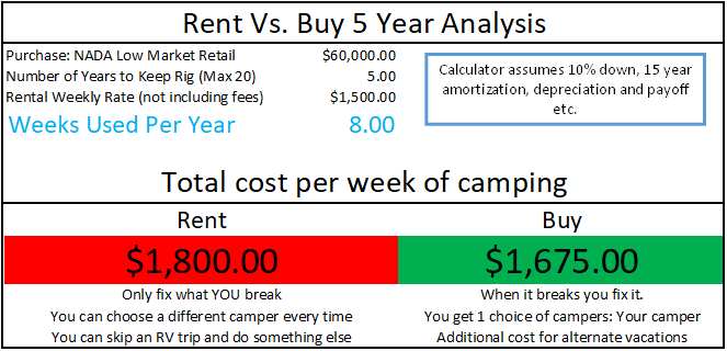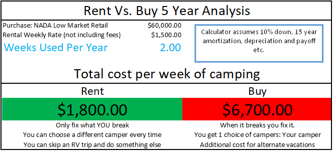 Well we have broken it down for you in to some really nifty charts. You may find that RENTING an RV would really fit better into your life. Renting has a whole lot of benefits that you may not have considered, such as not having to store it, not having to keep up with maintenance and insurance, not to mention if you rent your RV will never depreciate or be too outdated to stay at an RV park (Yes some parks don’t want rigs over 10 years old and require pictures!) Below are four charts that show the tipping point of when it makes more sense to buy vs rent.